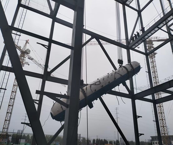2023年9月25日上午11時,由第一公司承建的新沂市陽光熱電有限公司3×280t循環(huán)硫化床鍋爐+1×25MW抽汽背壓式汽輪發(fā)電機(jī)組搬遷項(xiàng)目1#鍋爐汽包一次順利吊裝就位。
