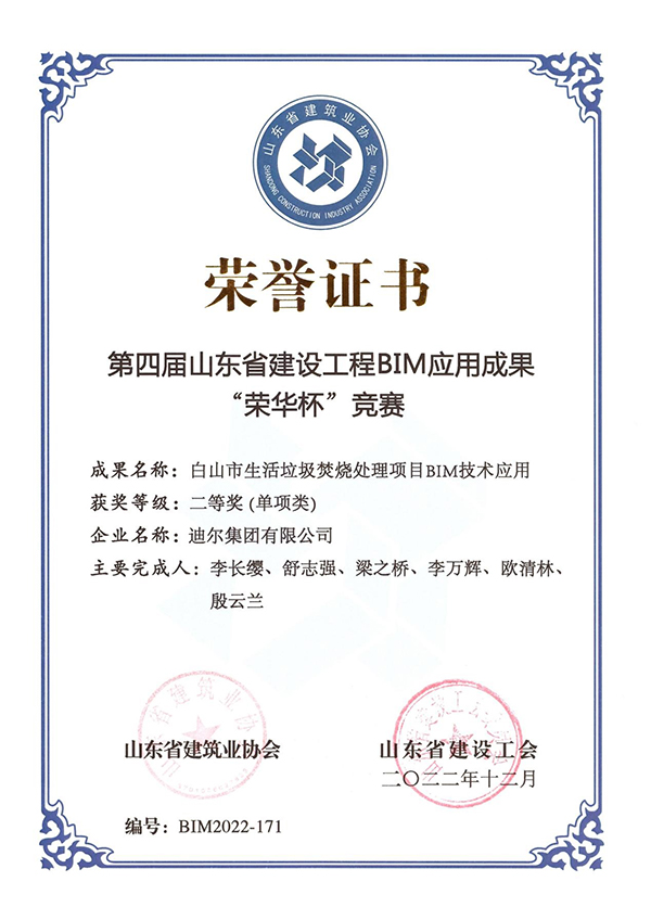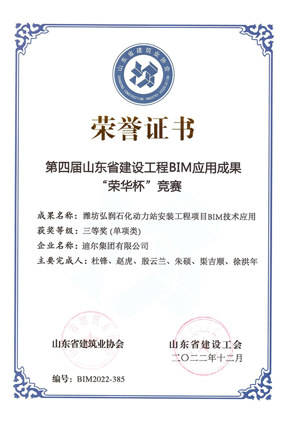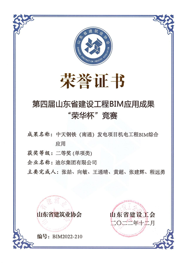 近日,由山東省建筑業(yè)協(xié)會、山東省建設(shè)工會聯(lián)合主辦的第四屆山東省建設(shè)工程BIM應(yīng)用成果“榮華杯”競賽結(jié)果評獎揭曉,迪爾集團有限公司經(jīng)專家評審、終評答辯和公示等環(huán)節(jié),最終獲得二等獎2項、三等獎2項的優(yōu)異成績