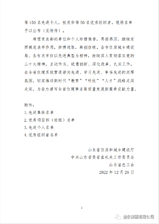 2022年12月28日,山東省住房和城鄉(xiāng)建設廳、中共山東省委省直機關工作委員會、山東省總工會聯(lián)合發(fā)布文件,迪爾集團有限公司在 2022年度全省住房城鄉(xiāng)建設系統(tǒng)重點工程“聚焦‘雙碳’目標 聚力新型建造”創(chuàng)新創(chuàng)優(yōu)勞動競賽中獲評“先進集體”榮譽稱號;迪爾集團山東豐源燃氣熱 2×200MW 燃氣-蒸汽聯(lián)合循環(huán)熱電聯(lián)產項目部獲評“優(yōu)秀項目部(班組)”榮譽稱號;公司員工趙建坡獲評“先進個人”榮譽稱號。